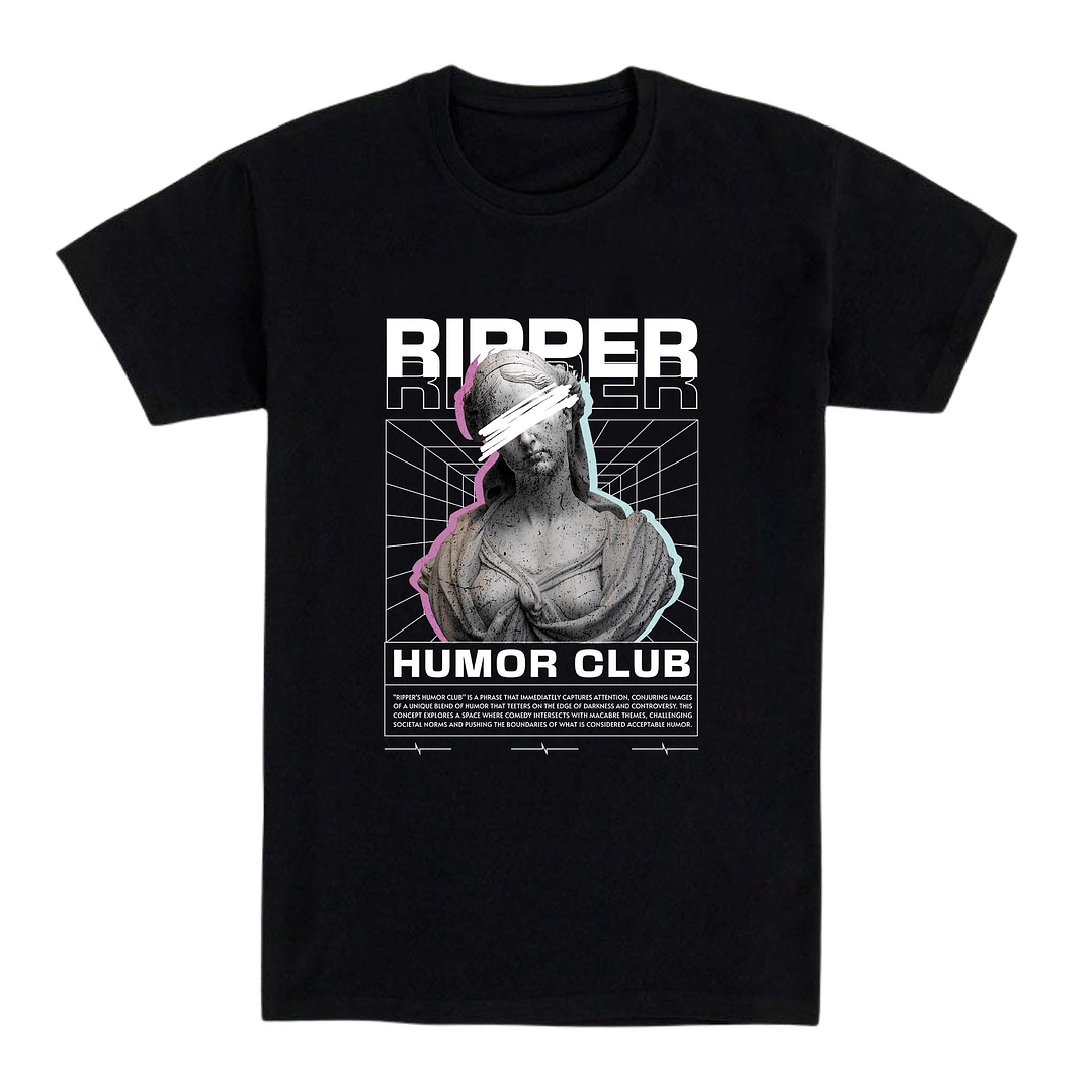 Arte clásico con glitch moderno. Esta camiseta negra combina una estatua renacentista con estética digital y neones glitch en rosa y azul, creando un contraste entre lo eterno y lo efímero. El fondo con líneas vectoriales y la tipografía en bloques dan un aire retro-futurista, mientras que el texto “Humor Club” aporta un guiño irónico a la cultura digital contemporánea.