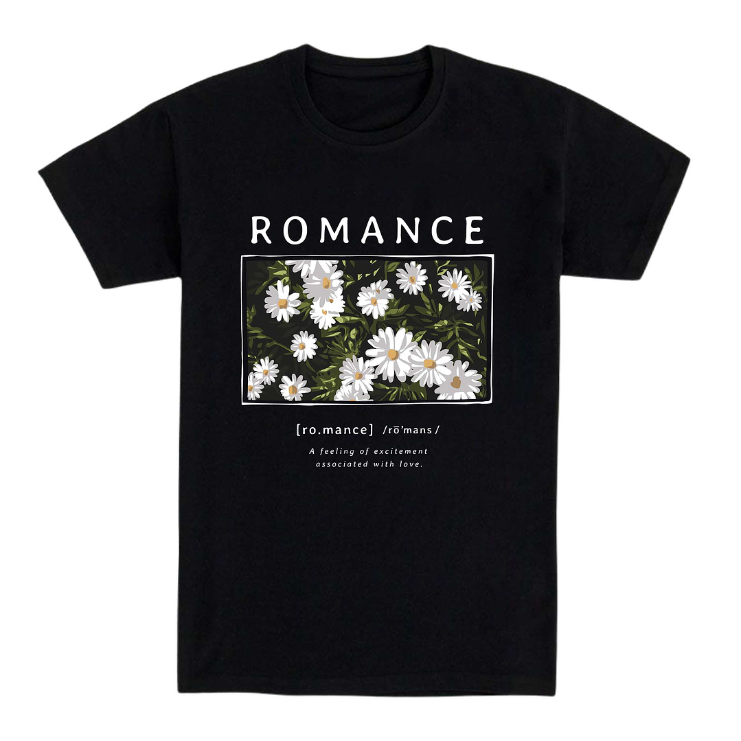 Una explosión de margaritas que florecen sobre fondo negro para recordarte que el amor también se lleva con estilo. La definición de "romance" le da ese toque poético que convierte esta camiseta en una declaración de intenciones.