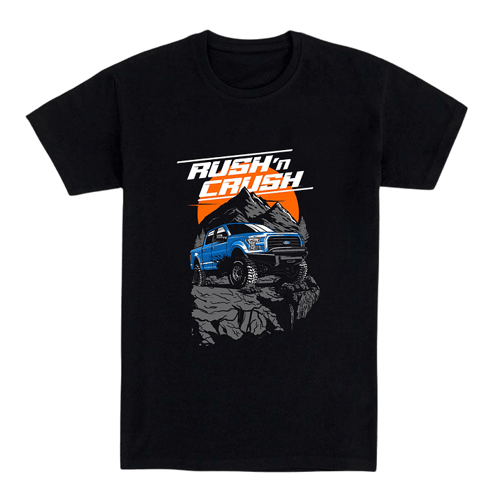Esta camiseta negra rinde homenaje a la fuerza bruta y la libertad del off-road. Con una ilustración de una camioneta azul escalando rocas frente a un atardecer montañoso, transmite pura adrenalina. El lema "Rush 'n Crush" refuerza el espíritu salvaje del diseño.