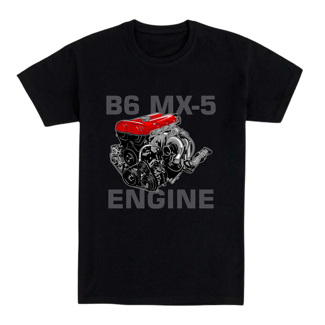 Para los puristas del motor, esta camiseta negra rinde homenaje a uno de los propulsores más queridos del mundo automovilístico. El diseño muestra con detalle técnico el icónico motor B6, resaltando su tapa roja brillante y la ingeniería compacta que lo hizo leyenda. Ideal para quienes saben que lo importante va bajo el capó.