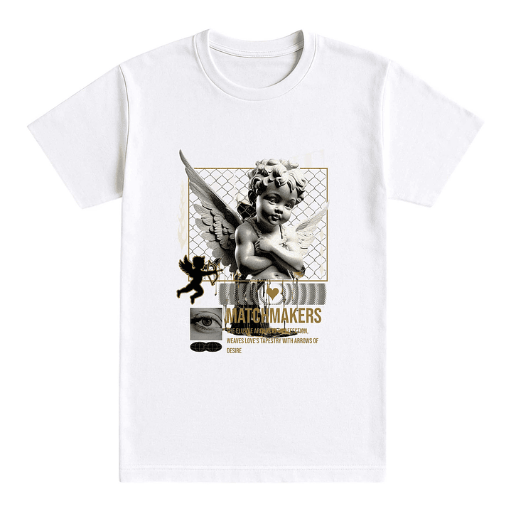 El amor vibra más alto cuando la música lo invoca. Esta camiseta blanca canaliza la esencia de los festivales donde los cuerpos se cruzan, las miradas se enredan y el deseo flota entre luces estroboscópicas. Un querubín moderno con alas metálicas se convierte en el símbolo de esas conexiones fugaces pero intensas, de los flechazos que solo ocurren en el éxtasis del beat. Ideal para almas románticas, rave lovers y creyentes del amor a primera canción.