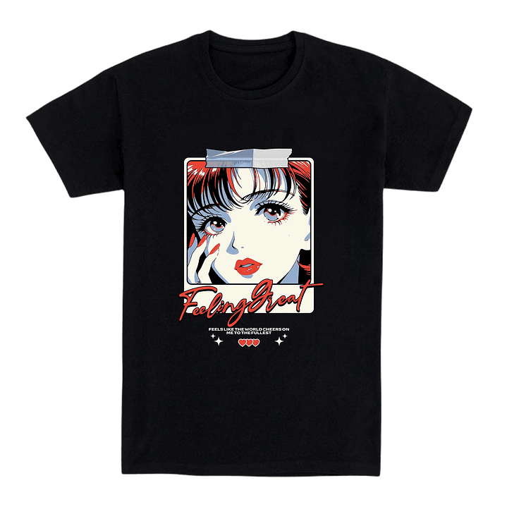 Una camiseta negra con una vibra positiva y estética japonesa retro. La ilustración tipo manga muestra a una chica con mirada intensa y labios rojos, acompañada de la frase "Feeling Great", ideal para quienes combinan estilo, confianza y pasión por el anime clásico.