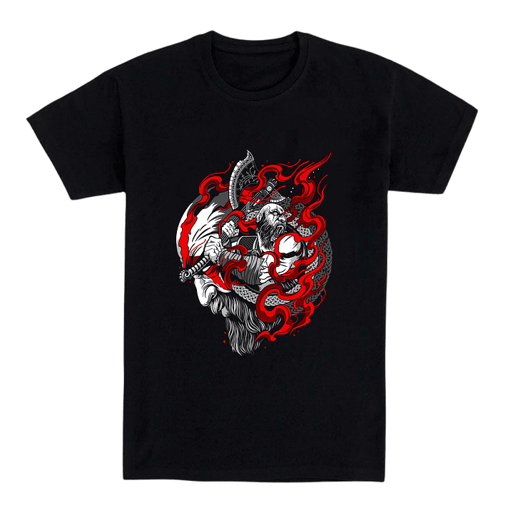 Una camiseta negra que desata pura energía. El diseño muestra a un guerrero épico envuelto en llamas rojas que parecen cobrar vida, con una estética que fusiona el manga más oscuro con mitología de combate. Una prenda pensada para quienes no temen destacar con un estilo brutal y guerrero.