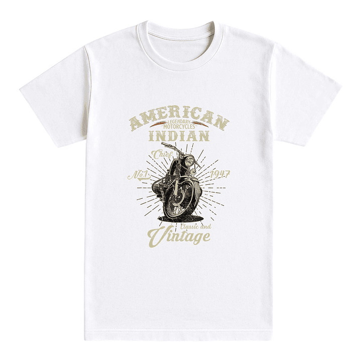 Una camiseta blanca que rinde homenaje al espíritu clásico del motociclismo americano. En el centro, una moto estilo Indian con estética retro se fusiona con textos como “Legendary Motorcycles”, “1947” y “Vintage”, evocando la época dorada del motor. Con un diseño sutil y elegante, esta camiseta es ideal para amantes de lo auténtico y lo atemporal sobre dos ruedas.
