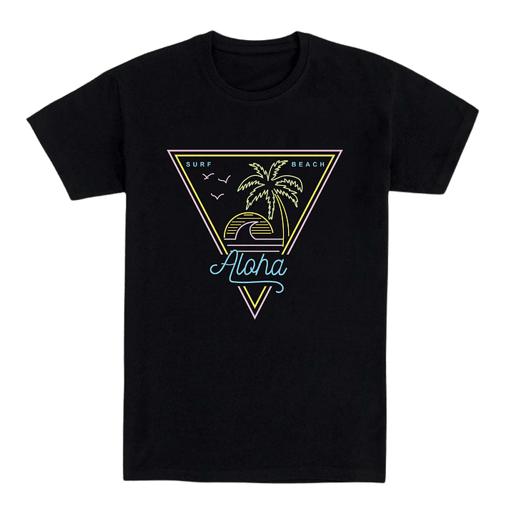 Esta camiseta "Aloha" es un homenaje al espíritu surfero y la estética neón de los 80. El diseño en forma de triángulo incluye palmeras, olas y colores vibrantes que evocan atardeceres en la playa y tardes de skate al ritmo del synthwave. Ideal para quienes viven en modo verano eterno.
