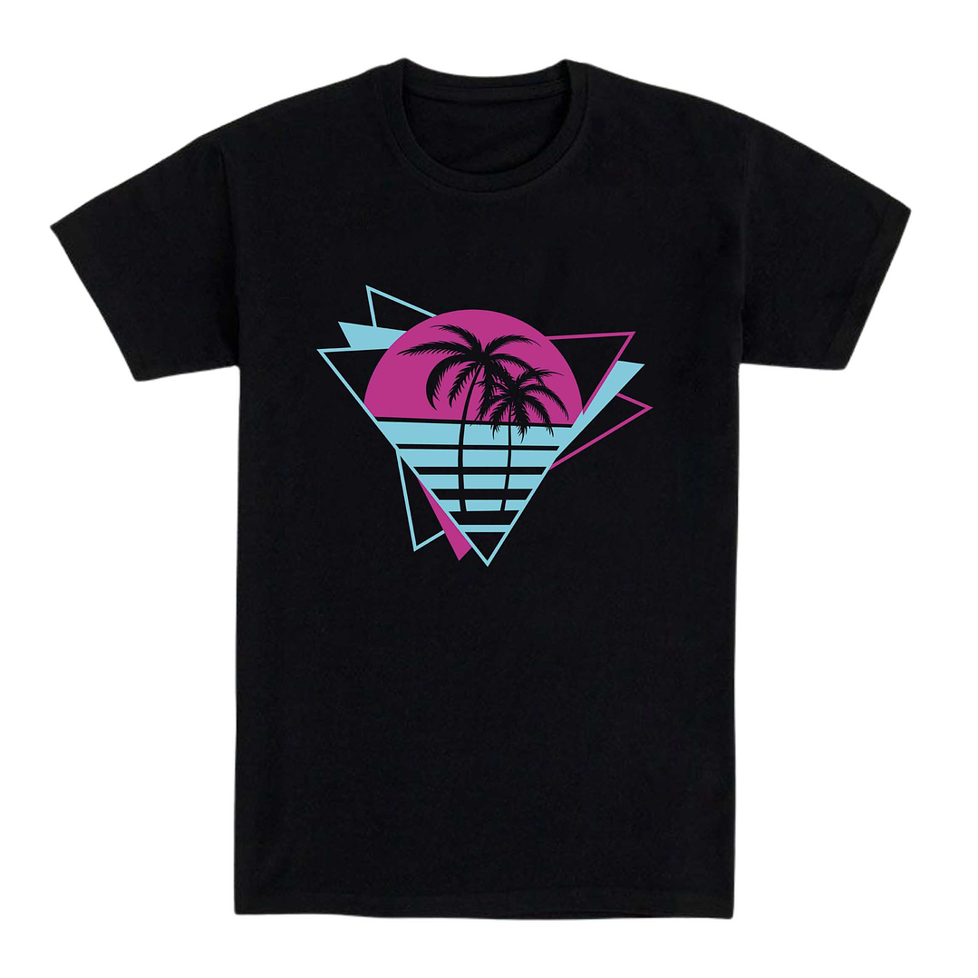Sumérgete en la estética ochentera con esta camiseta negra que rinde homenaje a los atardeceres de Miami y al estilo vaporwave. Con un diseño de palmeras silueteadas sobre formas geométricas y tonos neón, esta prenda es puro verano, nostalgia y flow retro.