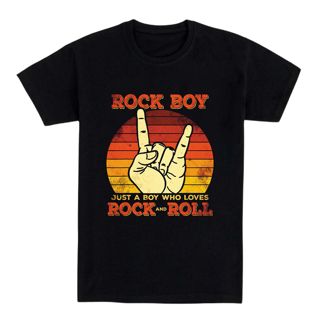 Esta camiseta es un tributo sincero a esa esencia: “Just a boy who loves rock and roll”. Un diseño cálido y nostálgico con fondo solar de tonos anaranjados y una mano haciendo los cuernos que dice más que mil palabras. Porque el rock no es solo un género: es lo que te hizo sentir vivo por primera vez.