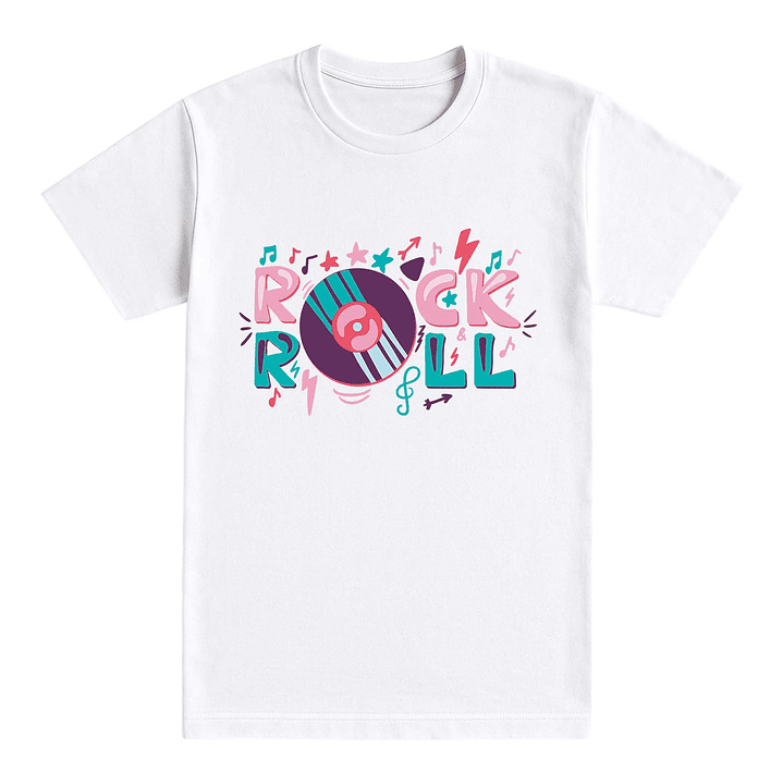 Esta camiseta es una explosión de color y buen rollo, perfecta para quienes aman el rock clásico pero lo viven a su manera. Con un vinilo en el centro y una tipografía divertida llena de notas, rayos y estrellas, este diseño transmite la esencia más alegre y despreocupada del rock & roll.