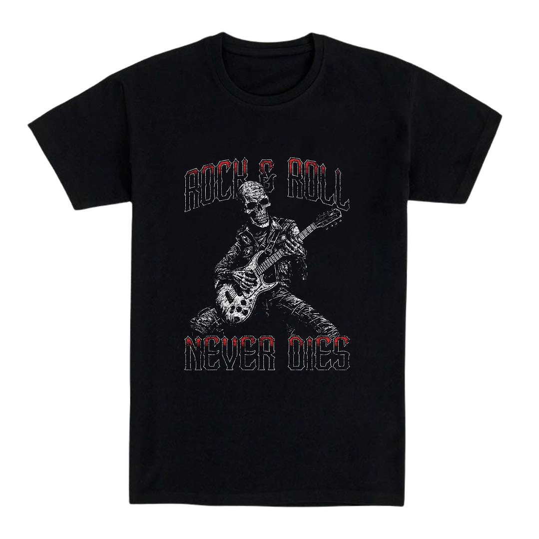 Esta camiseta es puro metal gráfico: un esqueleto encuerado en pose de solo eterno, una guitarra rugiendo bajo sus dedos y un mensaje que no necesita explicación. “Rock & Roll Never Dies” grabado con estilo gótico, delineado en rojo como si sangrara pasión por cada trazo. Ideal para quienes viven con distorsión en las venas y no piensan parar.